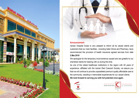 Iranian Hospital Dubai is very pleased to inform all its valued clients and customers that our main facilities – including Safa Clinics and Pharmacy, have recommenced the provision of health insurance agreed services from date 2.Mar.2019