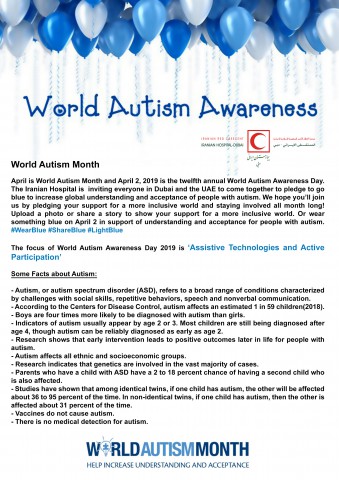 April is World Autism Month and April 2, 2019 is the twelfth annual World Autism Awareness Day. The Iranian Hospital invites everyone to come together to pledge to go blue to increase global understanding and acceptance of people with autism. Stay involved all month long! Upload a photo or share a story to show your support for a more inclusive world. Or wear something blue in support of understanding and acceptance for people