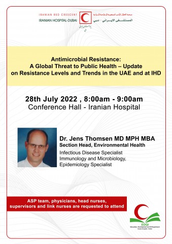 Contributing to the AMR surveillance data is an essential approach to: (1) define the scope of the resistance problem, (2) develop interventions that improve the appropriate application of antimicrobial agents, and (3) decrease resistance selection pressure. We are pleased to host Dr Jens Thomsen MD MPH. Head, UAE National Sub-Committee for AMR Surveillance.; UAE Focal Point for WHO-GLASS. ; Section Head, Environmental Health, Public Health Center, DoH- to discuss the updates on resistance levels and trends in the UAE and at Iranian Hospital Dubai.