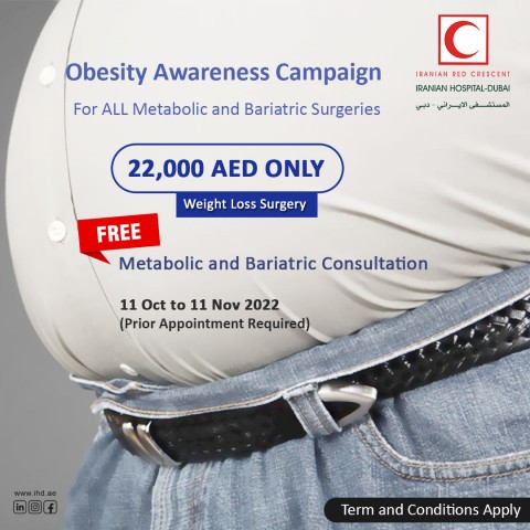 Obesity is a global problem, and it affects us all. 800 million of us are living with the disease, with millions more at risk. The UAE has an obesity prevalence rate of 31.7%. Obesity is a complex disease, with many root causes throughout society. That’s why we all need to work together to find solutions. Tackling the roots of obesity benefits everybody and will give us all the chance to lead happier, healthier and longer lives. Avail the one month Obesity Campaign offer in Iranian Hospital Dubai from 11th October to 11th November 2022. Free Bariatric consultation and ALL Obesity (weight loss) surgeries priced at 22,000 ONLY during the campaign. Take Control of Your Health- ACT TODAY!