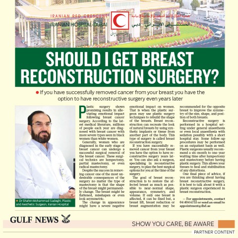 Breast cancer is the most common cancer diagnosed in women, accounting for more than 1 in 10 new cancer diagnoses each year. Read the article by Gulf News featuring our CEO Dr Shahin Mohammad Sadeghi (Specialist Plastic and Aesthetic Surgeon) elaborating on breast reconstruction after breast cancer surgery and Dr Imran Abbas (laparoscopic Weight Loss Surgeon) explaining the effects of obesity and breast cancer risk. For access to full article: