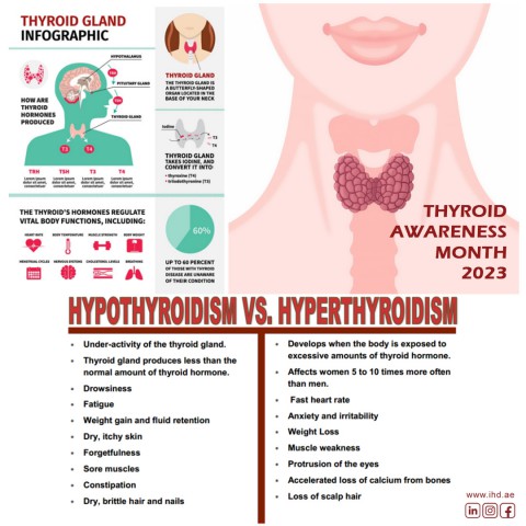 January is National Thyroid Awareness Month. Around five per cent of the population in the UAE suffer from thyroid disease. The thyroid is a small butterfly shaped gland located just above your collarbone and in front of the windpipe. This gland controls important functions such as regulating breathing, heart rate, body weight, muscle strength, cholesterol, and body temperature. Thyroid disease refers to a number of conditions that affect how the gland functions. The thyroid can be either overactive or underactive and both conditions can lead to health problems. Two of the most common thyroid diseases are hyperthyroidism and hypothyroidism.