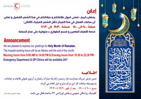 The Iranian Hospital Specialty Clinics working hours will be as follows until the end of Ramadan: