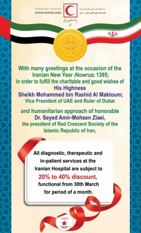 As part of Iranian New Year Celebration (Nowruz) and to fulfill the charitable and good wishes of His Highest Sheikh Mohammed bin Rashid Al Maktoum Vice President of UAE and Ruler of Dubai and Humanitarian approach of Honorable Dr. Seyed Amir-Mohsen Zhiaei the President of Red Crescent Society of the Islamic Republic of Iran, All Diagnostic, Therapeutic and in-patient Services of Iranian Hospital Dubai are subject to 20% to 40% discount. For more details please dial (+971) 4 344 0250.