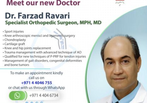 We are pleased to introduce Mr Farzad Ravari, Specialist Orthopedic Surgeon (MD, MPH) with over 18 years of experience in the field of orthopedics, sport injuries, knee arthroscopic menisci and ligaments surgery, chondroplasty, cartilage graft, knee and hip replacement surgery, regenerative medicine procedures for tendon injuries, congenital deformities, bone tumours, management of gait disorders, radiculopathies,…