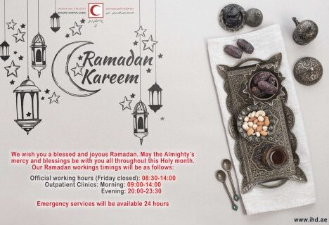 We wish you a blessed and joyous Ramadan. May the Almighty’s mercy and blessings be with you all throughout this Holy month. Our Ramadan workings timings will be as follows: Official working hours (Friday closed): 08:30-14:00 Outpatient Clinics: Morning 09:00-14:00 and Evening 20:00-23:30 Emergency services will be available 24 hours