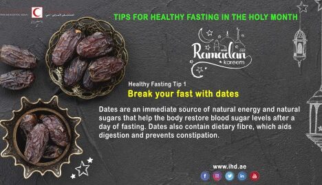 Tips for healthy fasting in the Holy Month Break your fast with dates.Dates are an immediate source of natural energy and natural sugars that help the body restore blood sugar levels after a day of fasting. Dates also contain dietary fibre, which aids digestion and prevents constipation.