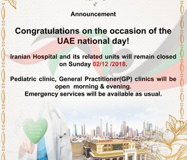 Congratulations on the occasion of the UAE national day! Iranian Hospital and its related units will remain closed on Sunday 02/12 /2018.Pediatric clinic, General Practitioner(GP) clinics will be open morning & evening.Emergency services will be available as usual.
