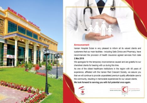 Announcement Iranian Hospital Dubai is very pleased to inform all its valued clients and customers that our main facilities – including Safa Clinics and Pharmacy, have recommenced the provision of health insurance agreed services from date 2.Mar.2019 We apologize for the temporary inconvenience caused and are grateful to our cherished clients for bearing with us…