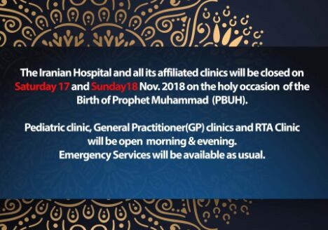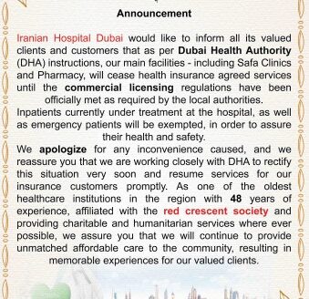 Announcement Iranian Hospital Dubai would like to inform all its valued clients and customers that as per Dubai Health Authority (DHA) instructions, our main facilities – including Safa Clinics and Pharmacy, will cease health insurance agreed services until the commercial licensing regulations have been officially met as required by the local authorities.Inpatients currently under treatment…