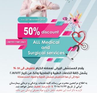 The Iranian Hospital is pleased to offer up to 50% discount on All Medical and Surgical services provided in the hospital commencing from 22nd November 2018. Medications and medical consumables will be excluded from the offer. For more information, please contact:04 4046755, 04 4046756, 04 4046757, 04 4046758
